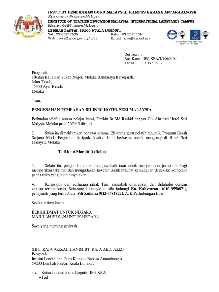 Confirmation Letter Hotel Seri Malaysia