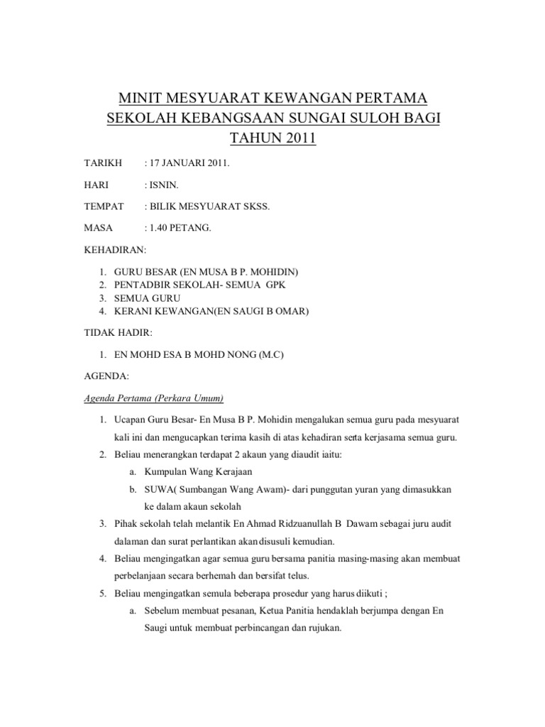 Contoh Minit Mesyuarat Kewangan Sekolah