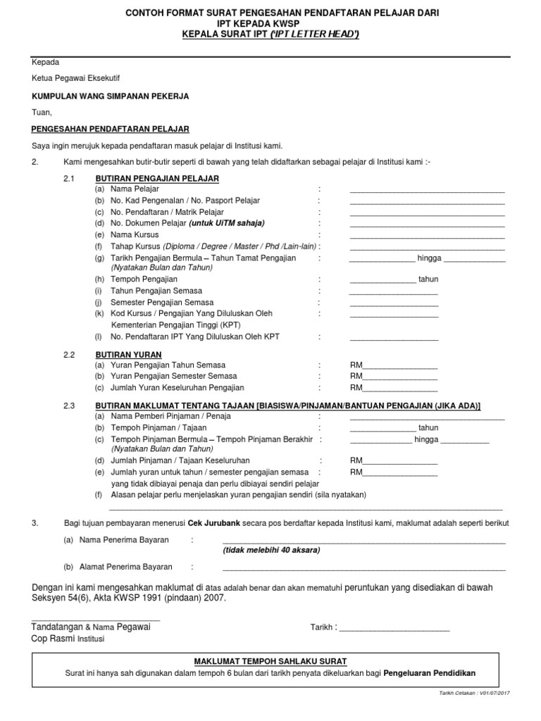 Sekiranya anda memerlukan bantuan. Contoh format surat pengesahan pendaftaran pelajar dari ipt kepada kwsp kepala surat ipt ipt letter head kepada ketua pegawai eksekutif kumpulan wang simpanan pekerja tuan pengesahan pendaftaran pelajar saya ingin merujuk kepada pendaftaran masuk pelajar di institusi kami. Permohonan kini dibuka kepada pelajar yang layak sehingga 17 september 2020. Surat akuan pengesahan pendapatan adalah khusus buat individu yang bekerja sendiri dan tidak mempunyai slip gaji.