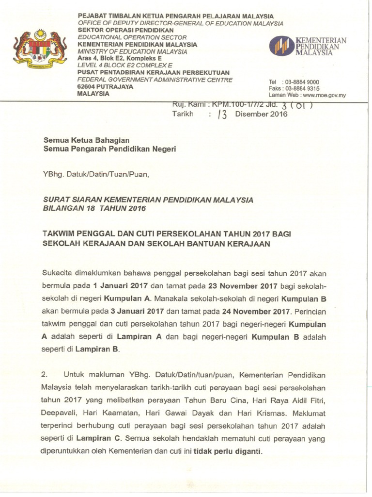 Surat Siaran Kpm Takwim Penggal Cuti Sekolah 2017 Pdf
