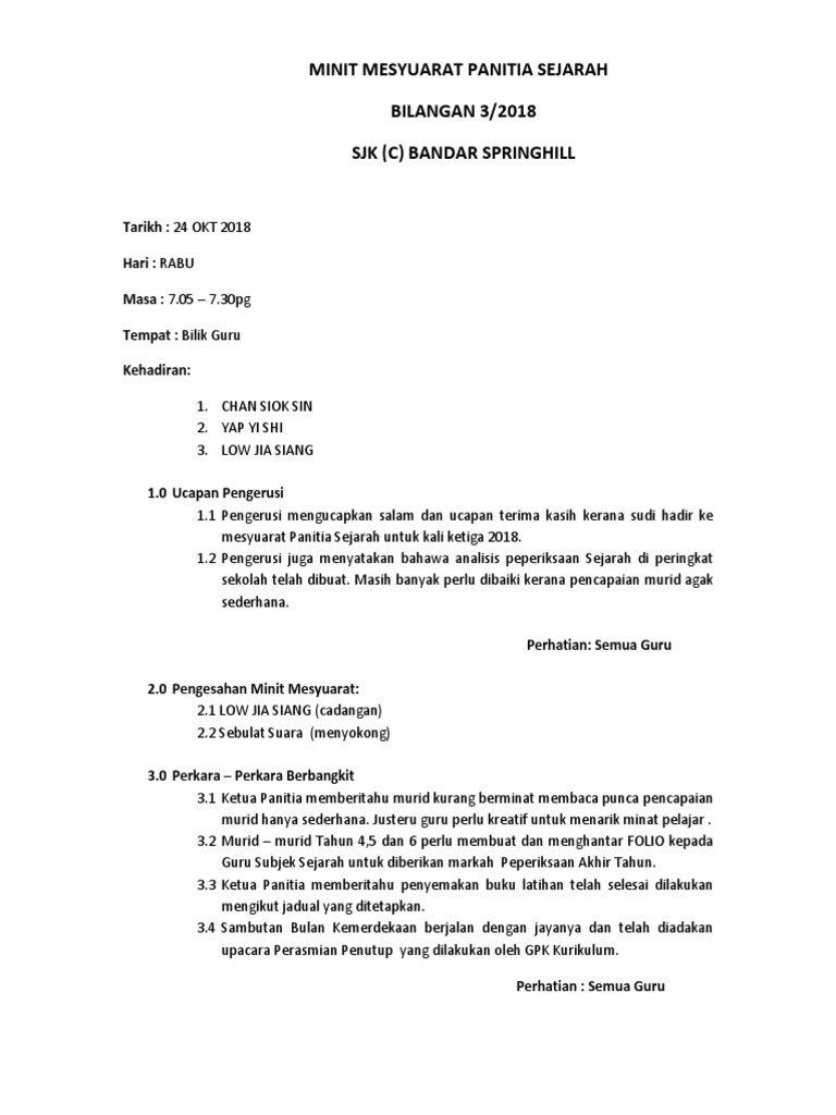 Minit mesyuarat panitia sejarah kali kedua 2019. Sama sama bantu membantu antara satu sama lain. Perancangan strategik panitia sejarah tahun 2011. Chua kai huat 5. Minit mesyuarat panitia sejarah kali pertama tarikh.